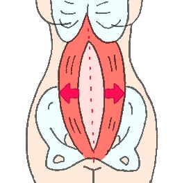 これにより、腹直筋を中央でつなぐ白線が引き伸ばされ、左右の腹直筋が離れてしまうのです。​